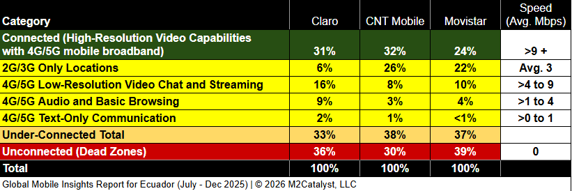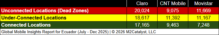 • Claro has the lowest under-connected location percentage at 33%, while the other MNOs range between 37% and 38%.
