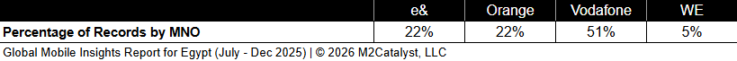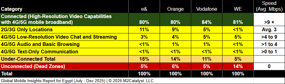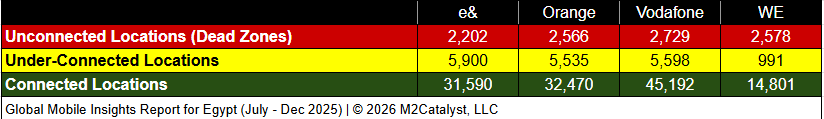 • e& and Orange have the greatest under-connected location percentages at 15% and 14%, respectively, while all other MNOs range between 5% and 11%.