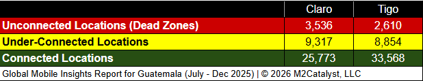 • Movistar has the greatest Dead Zone location percentage at 33%, while the other MNOs range between 22% and 28%.