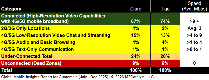 M2’s proprietary Mobile Broadband Quality algorithm comprehensively evaluates various factors, including signal strength, signal quality, and throughput, across (1) the 4G/5G service footprint for each country's national Mobile Network Operators (MNOs), (2) the 2G/3G-only service footprint for each MNO, and (3) areas where mobile devices are active but unable to detect any service. Within the M2 dataset, each 1km bin with mobile activity is then assessed to determine the highest mobile use case it can support, resulting in its classification as Connected, Under-Connected, or Unconnected.