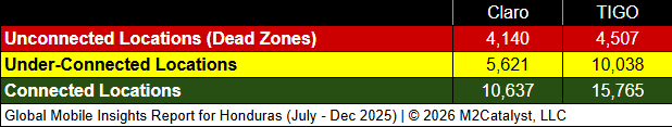 • Tigo has the greatest connected location percentage at 52% (without rounding in our dataset), while also having the lowest Dead Zone location percentage at 15% in our dataset.
