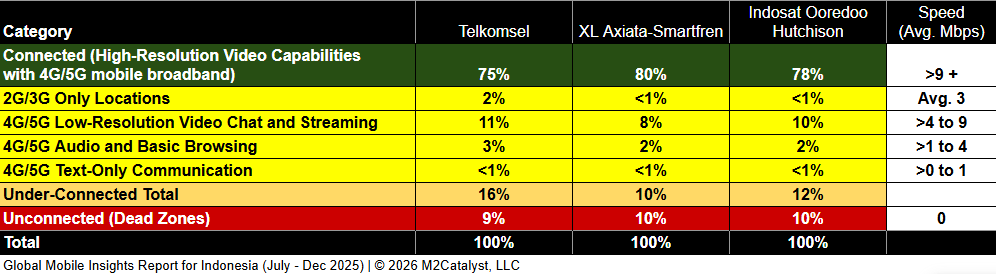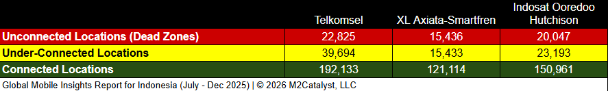 • Telkomsel has the greatest under-connected location percentage at 16%, while all other MNOs range between 10% and 12%.