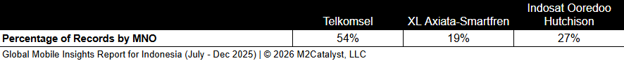 • XL Axiata-Smartfren has the greatest connected location percentage at 80%, while all other MNOs range between 75% and 78%.