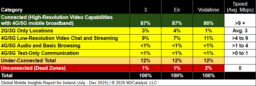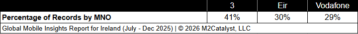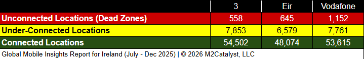 • All MNOs have relatively similar under-connected location percentages with Eir having the least (without rounding) in our dataset.