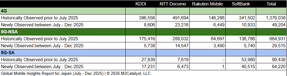 • The number of 5G-SA Cell IDs is approximately 45% of the newly observed Cell IDs with Softbank contributing over 63% of those.