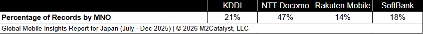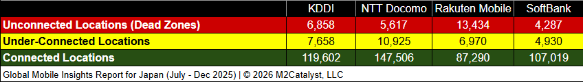 • All MNOs have relatively similar under-connected location percentages with NTT Docomo having the greatest without rounding in our dataset.