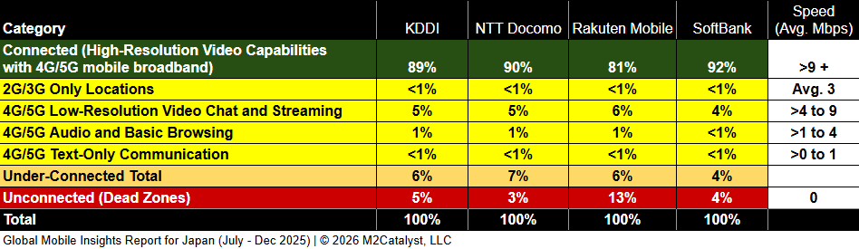 • Rakuten Mobile has the greatest Dead Zone location percentage at 13%, while all other MNOs range between 3% and 5%.