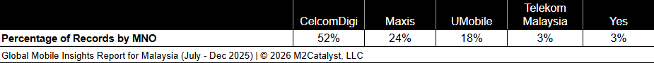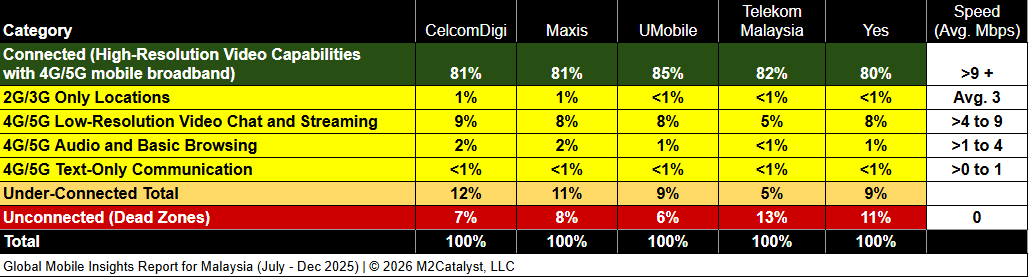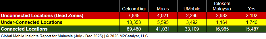 • CelcomDigi has the greatest under-connected location percentage at 12%, while all other MNOs range between 5% and 11%.