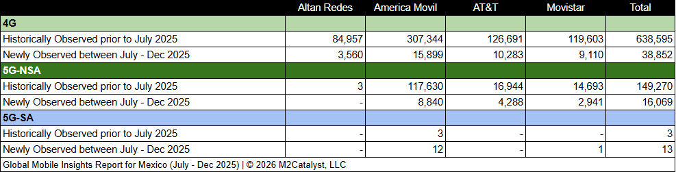 • The number of 5G-NSA Cell IDs is approximately 29% of the newly observed Cell IDs with America Movil contributing over 55% of those.