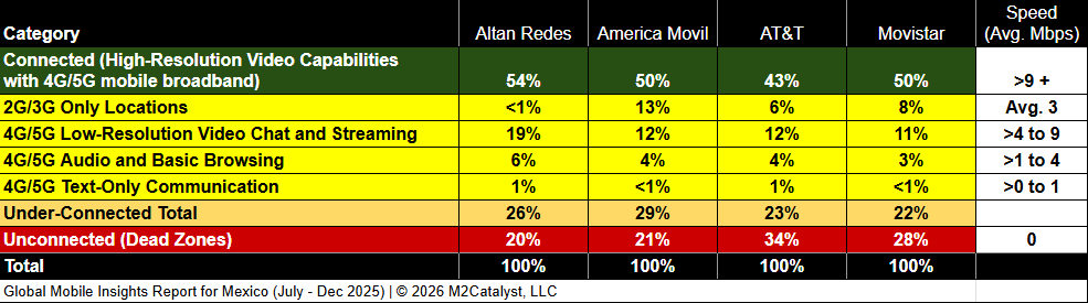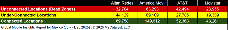 • Movistar has the lowest under-connected location percentages at 22%, while the other MNOs range between 23% and 29%.
