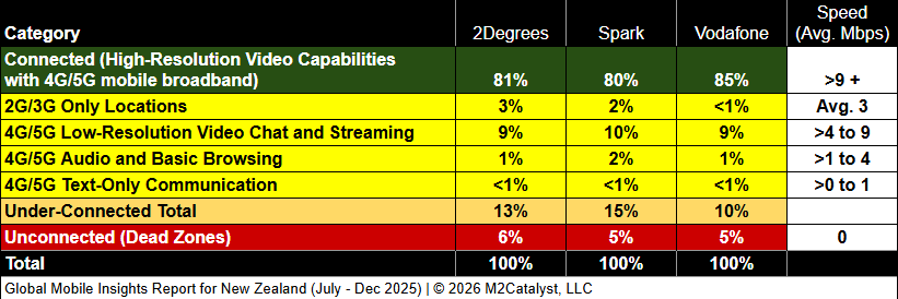 • Vodafone has the greatest connected location percentage at 85%, while the other MNOs range between 80% and 81%.