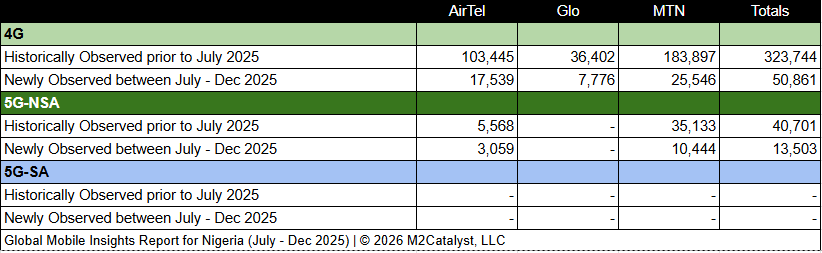 • M2’s dataset for the 2nd half of 2025 contains 69,953 newly observed 4G/5G mobile broadband Cell IDs. A more in-depth view of the Cell IDs and their associated details by location over time can be visualized on M2's Crowd SiteIntel platform.
