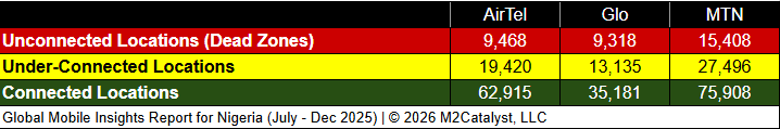 • This study identified a minimum of 15,408 and a maximum of 34,194 unconnected bins (Dead Zones aka Not-Spots), depending on the degree of overlap. This represents between 10% and 22% of the unique bin count (locations reporting at least one quality reading from any of the MNOs in the study).