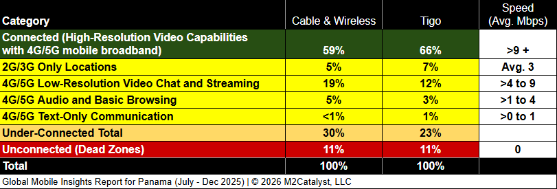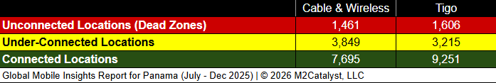 • Tigo has the greatest connected location percentage at 66%, while also having the lowest under-connected location percentage at 23% in our dataset.