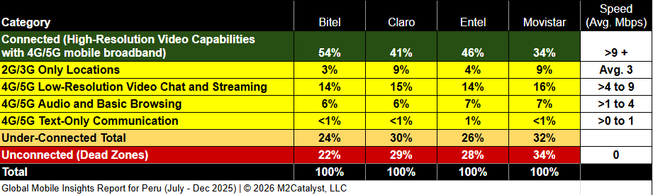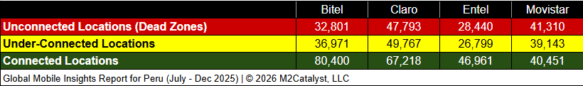 • Movistar has the greatest Dead Zone location percentage at 34%, while the other MNOs range between 22% and 29%.