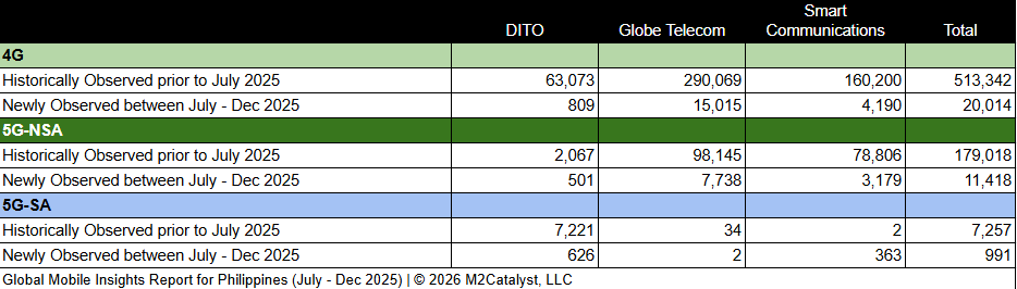 • M2’s dataset for the 2nd half of 2025 contains 32,423 newly observed 4G/5G mobile broadband Cell IDs. A more in-depth view of the Cell IDs and their associated details by location over time can be visualized on M2's Crowd SiteIntel platform.