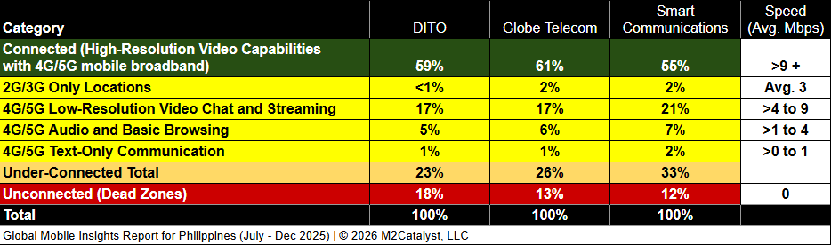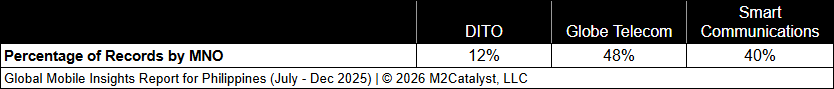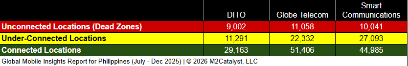 • DITO and Globe Telecom have the greatest connected location percentages at 61% and 59%, respectively, while Smart Communications has 55% in our dataset.