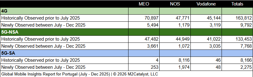 • The number of 5G-SA Cell IDs is approximately 11% of the newly observed Cell IDs with NOS contributing over 87% of those.