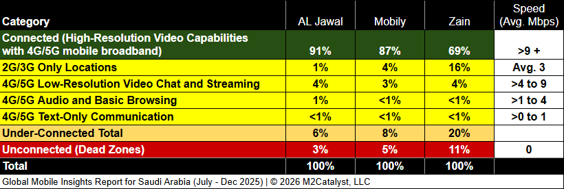 • Zain has the greatest under-connected location percentage at 20% and the greatest Dead Zone location percentage at 11%.