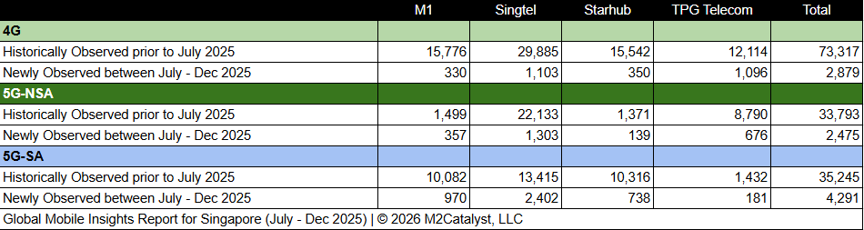 • The number of 5G-SA Cell IDs is approximately 44% of the newly observed Cell IDs with Singtel contributing over 56% of those.
