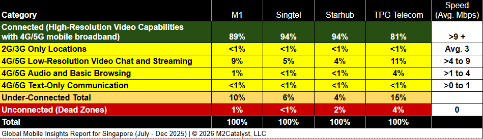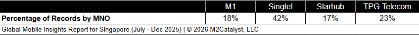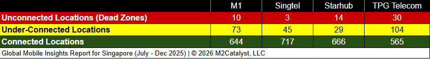 • Starhub and Singtel have the greatest connected location percentages at 94%, while all other MNOs range between 81% and 89% in our dataset.