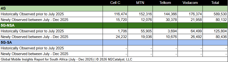 • M2’s dataset for the 2nd half of 2025 contains 160,568 newly observed 4G/5G mobile broadband Cell IDs. A more in-depth view of the Cell IDs and their associated details by location over time can be visualized on M2's Crowd SiteIntel platform.