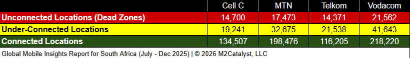 • Vodacom has the greatest under-connected location percentage at 15%, while all other MNOs range between 11% and 14%.