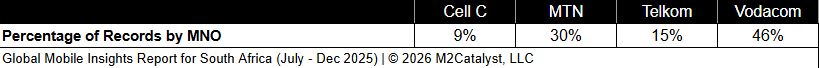 • MTN and Cell C have the greatest connected location percentage at 80%, while all other MNOs range between 76% and 77% in our dataset.