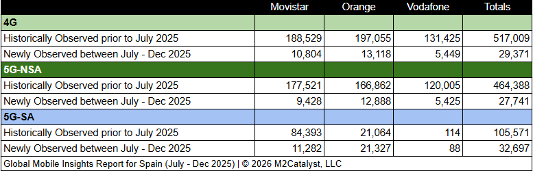 • The number of 5G-SA Cell IDs is approximately 36% of the newly observed Cell IDs with Orange contributing over 65% of those..