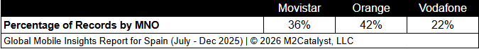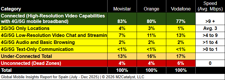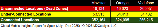 • Vodafone has the greatest under-connected location percentage at 17% and Movistar has the lowest at 13%.