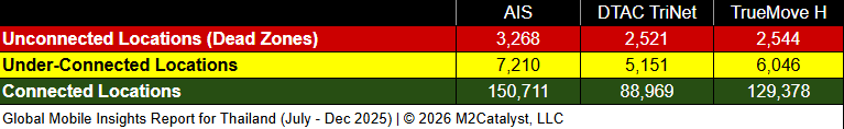 • DTAC TriNet have the greatest under-connected location percentages each at 5%, while all other MNO hover at 4%.