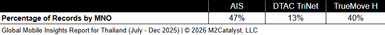 • TrueMove H has the greatest connected location percentage at 94%, while all other MNOs range between 92% and 93% in our dataset.