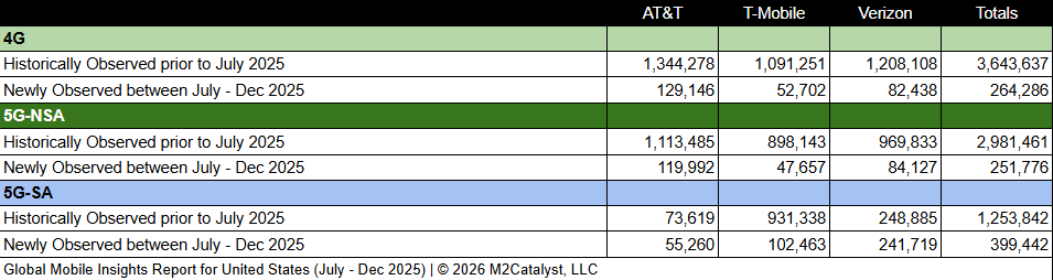 • The number of 5G-SA Cell IDs is approximately 44% of the newly observed Cell IDs with Verizon contributing over 61% of those.
