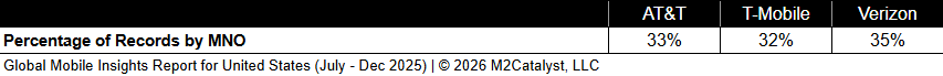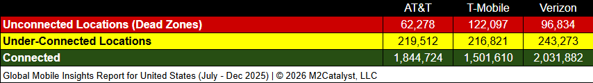 • AT&T has the greatest connected location percentage at 87%, while the other MNOs in our dataset range between 81% and 86%.